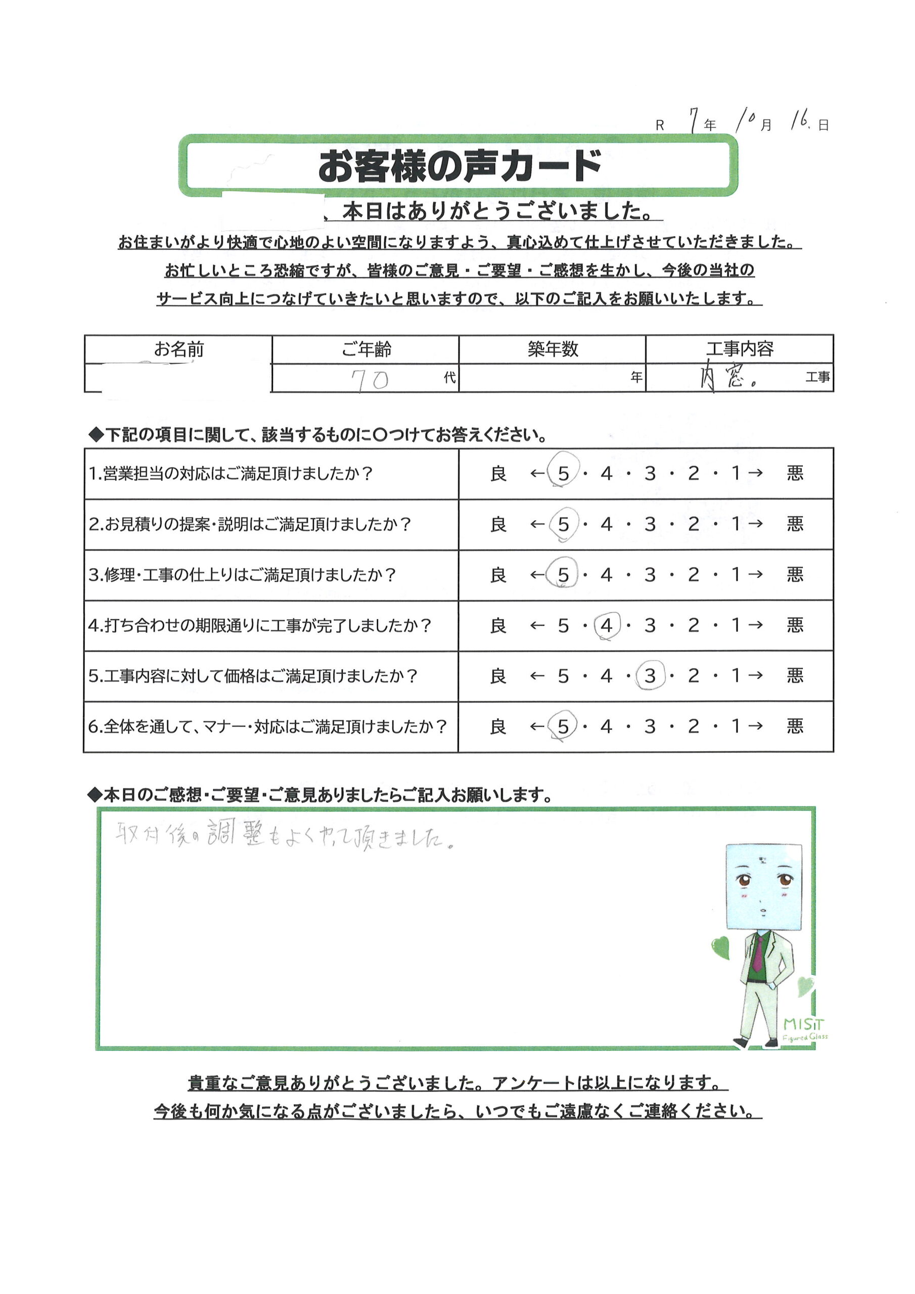 栃木市 O様のお声 取付後の調整もよくやって頂きました! 営業担当の対応はご満足頂けましたか? 5 4 3 2 1 お見積りの提案、説明はご満足頂けましたか? 5 4 3 2 1 修理・工事の仕上りはご満足頂けましたか? 5 4 3 2 1 打ち合せの期限通りに工事が完了しましたか? 5 4 3 2 1 工事内容に対して価格はご満足頂けましたか? 5 4 3 2 1 全体を通してマナー・対応はご満足頂けましたか? 5 4 3 2 1 本日のご感想・ご要望・ご意見ありましたらご記入お願いします。 取付後の調整もよくやって頂きました! 前の記事 一覧へ戻る