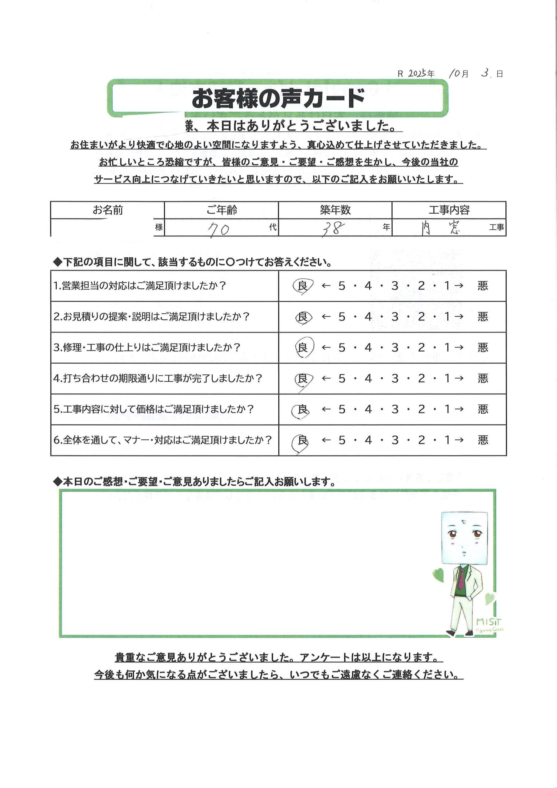 栃木市 S様のお声 内窓の工事をお願いしました! 営業担当の対応はご満足頂けましたか? 5 4 3 2 1 お見積りの提案、説明はご満足頂けましたか? 5 4 3 2 1 修理・工事の仕上りはご満足頂けましたか? 5 4 3 2 1 打ち合せの期限通りに工事が完了しましたか? 5 4 3 2 1 工事内容に対して価格はご満足頂けましたか? 5 4 3 2 1 全体を通してマナー・対応はご満足頂けましたか? 5 4 3 2 1 本日のご感想・ご要望・ご意見ありましたらご記入お願いします。 前の記事 次の記事 一覧へ戻る