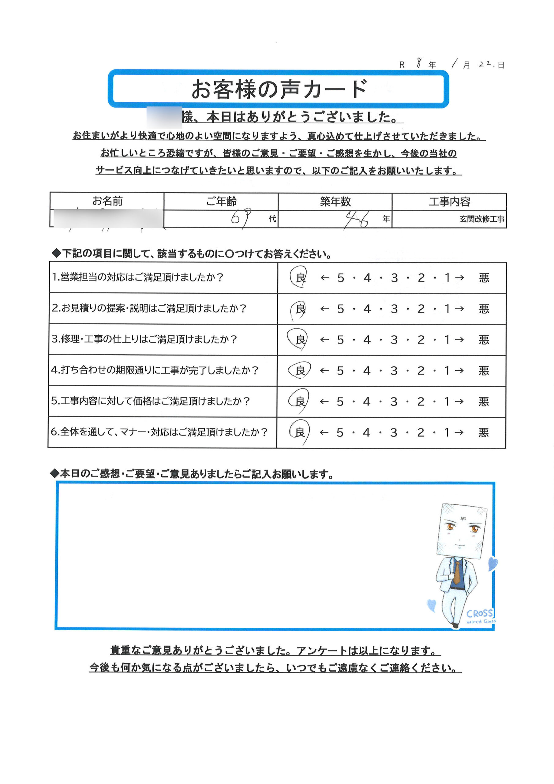 栃木市 S様のお声 玄関改修工事をお願いしました 営業担当の対応はご満足頂けましたか? 5 4 3 2 1 お見積りの提案、説明はご満足頂けましたか? 5 4 3 2 1 修理・工事の仕上りはご満足頂けましたか? 5 4 3 2 1 打ち合せの期限通りに工事が完了しましたか? 5 4 3 2 1 工事内容に対して価格はご満足頂けましたか? 5 4 3 2 1 全体を通してマナー・対応はご満足頂けましたか? 5 4 3 2 1 本日のご感想・ご要望・ご意見ありましたらご記入お願いします。 前の記事 次の記事 一覧へ戻る