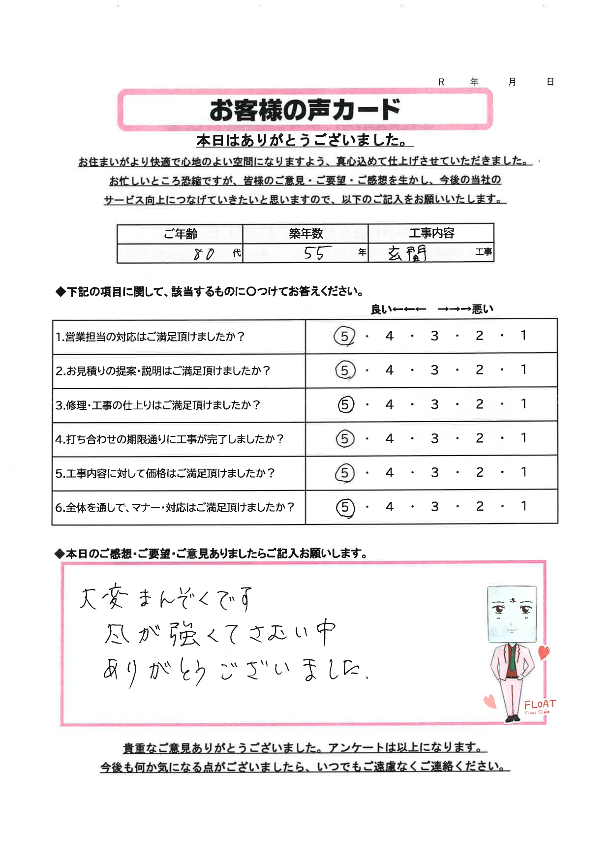 栃木市 M様のお声 大変満足です! 営業担当の対応はご満足頂けましたか? 5 4 3 2 1 お見積りの提案、説明はご満足頂けましたか? 5 4 3 2 1 修理・工事の仕上りはご満足頂けましたか? 5 4 3 2 1 打ち合せの期限通りに工事が完了しましたか? 5 4 3 2 1 工事内容に対して価格はご満足頂けましたか? 5 4 3 2 1 全体を通してマナー・対応はご満足頂けましたか? 5 4 3 2 1 本日のご感想・ご要望・ご意見ありましたらご記入お願いします。 大変満足です。 風が強くて寒い中、ありがとうございました。 前の記事 一覧へ戻る