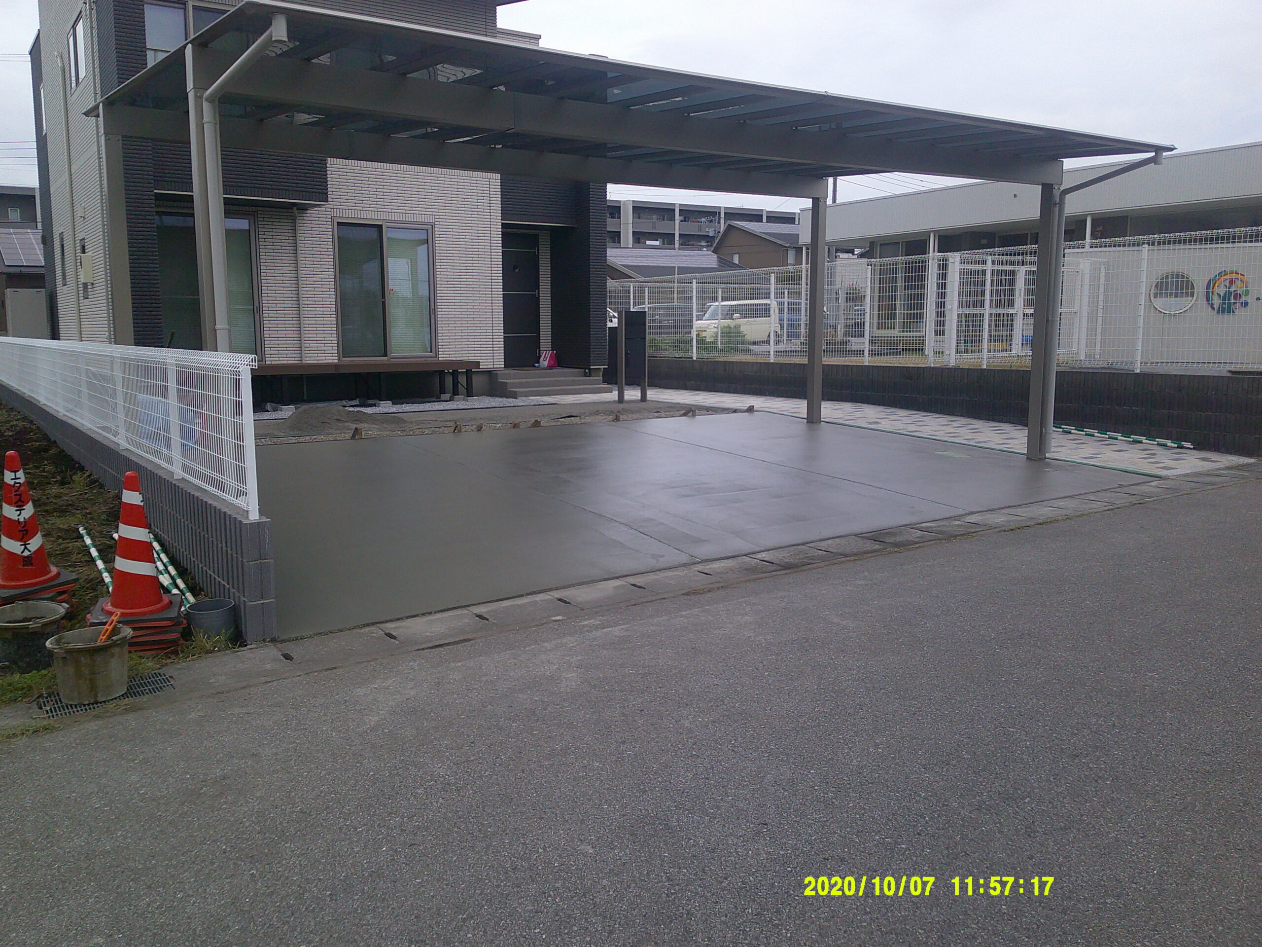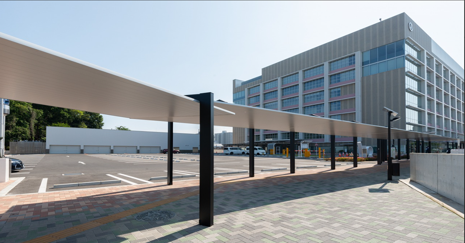 事務所のエントランスをみんなが使いやすく一新! 雨よけの庇+モダンな格子で、機能性とデザイン性を両立しました。段差を解消し、手すり付きのスロープでバリアフリーにも対応。